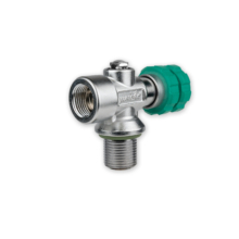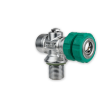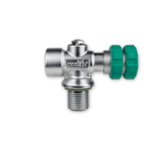 For mono scuba equipment – especially rebreathers – (all tank diameters) with tank neck thread according to US-Standard ¾“ NPSM. Nautec SLS valves are standard shut off devices in accordance to DIN EN 12209 (Pipe G 5/8“), for an max. operating pressure of 232 bar with horizontally arranged shut-off mechanism and outlet. Only 1 first stage can be connected. Equipped with green “Full-Metal-Core-Rubber Knobs” (for maximum grip) and safety burst disc, releasing at 300 bar.