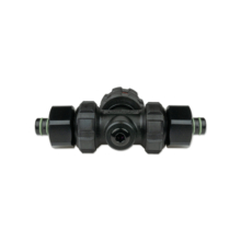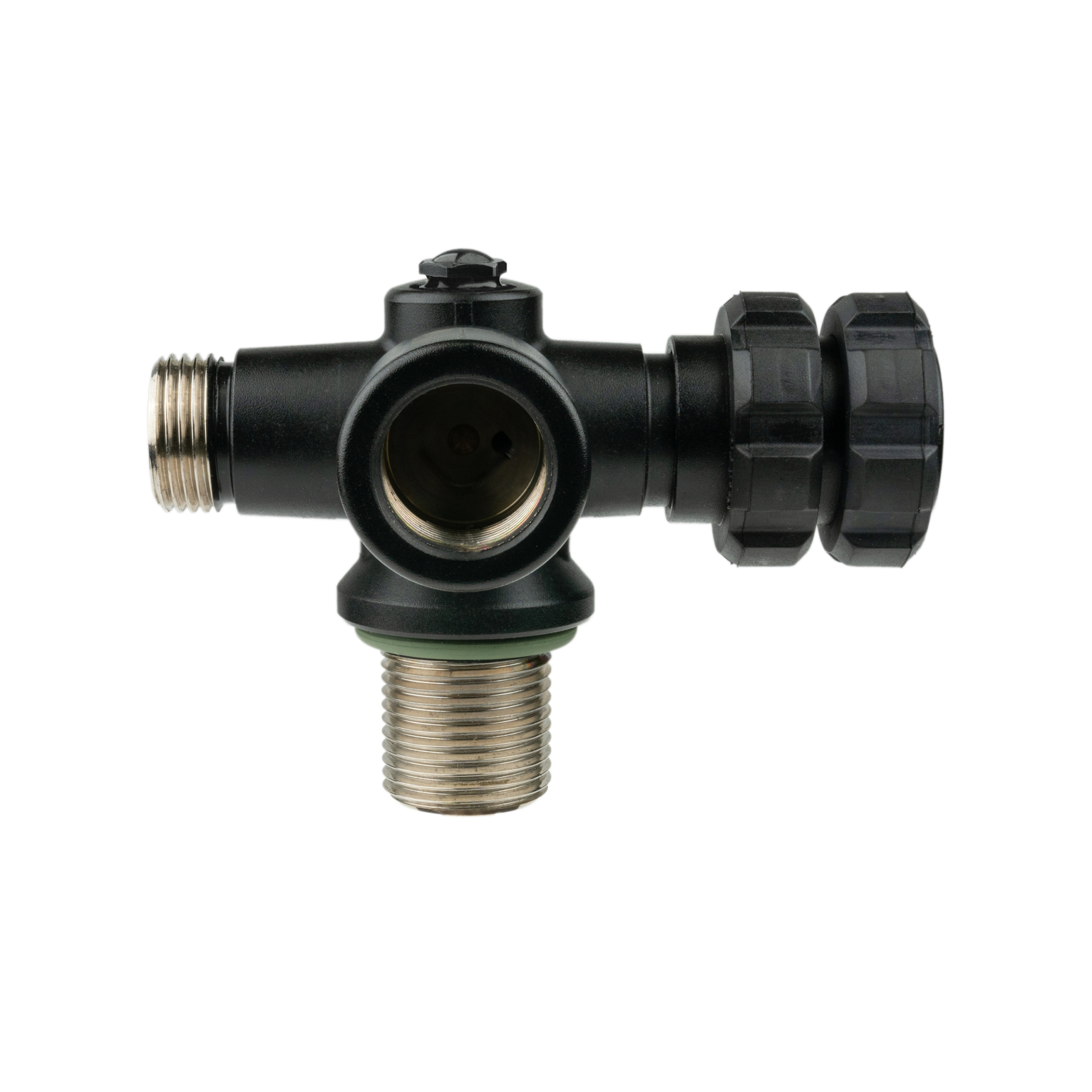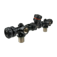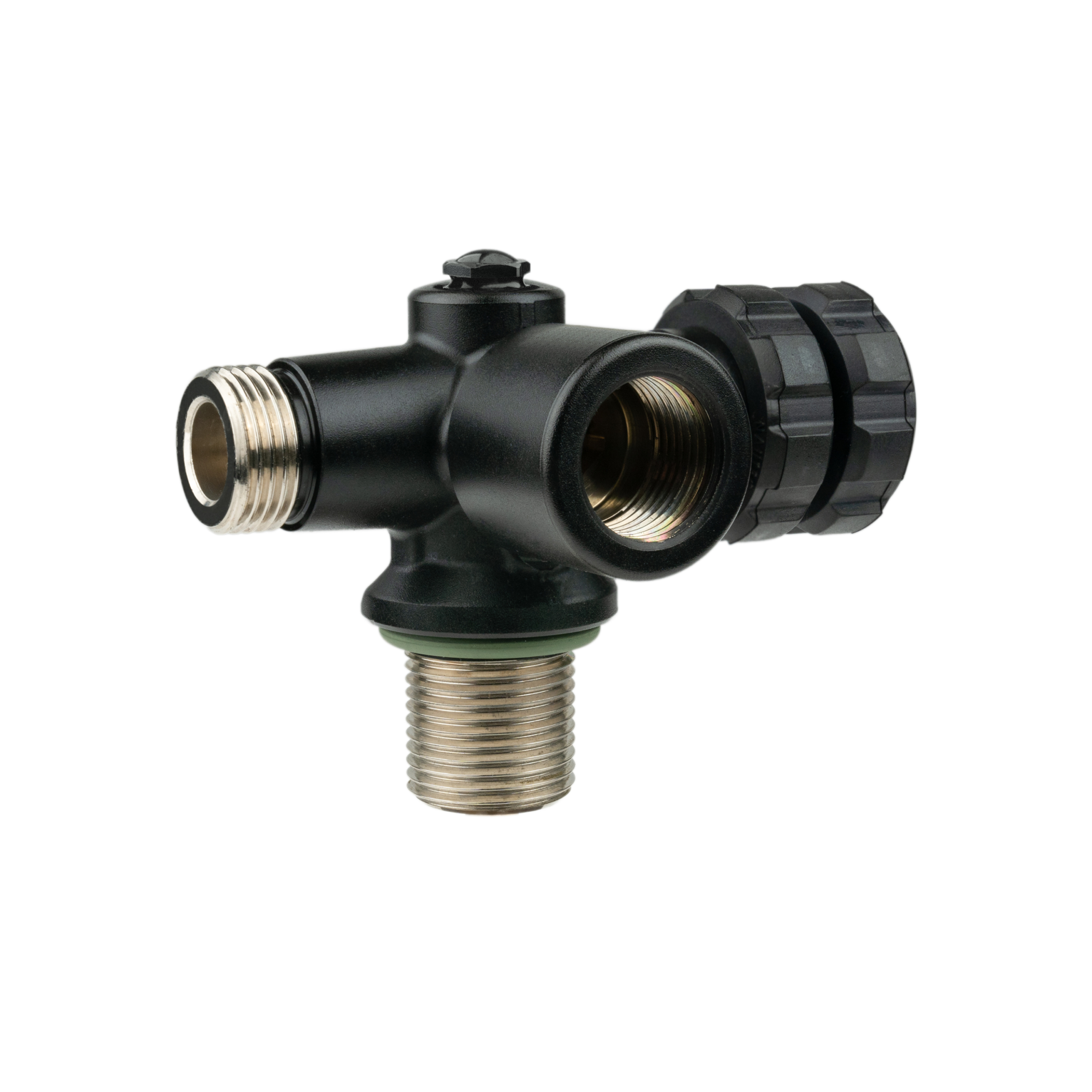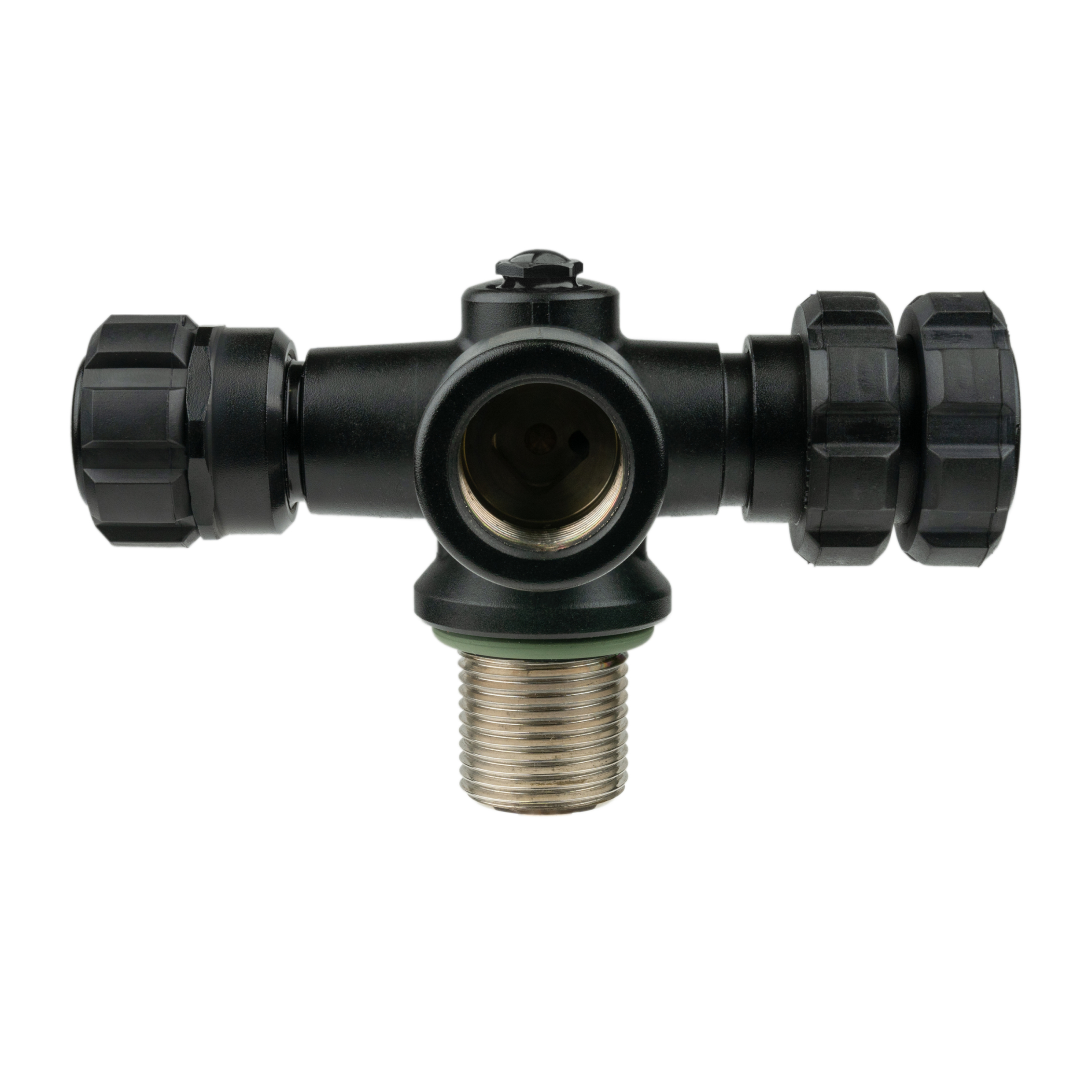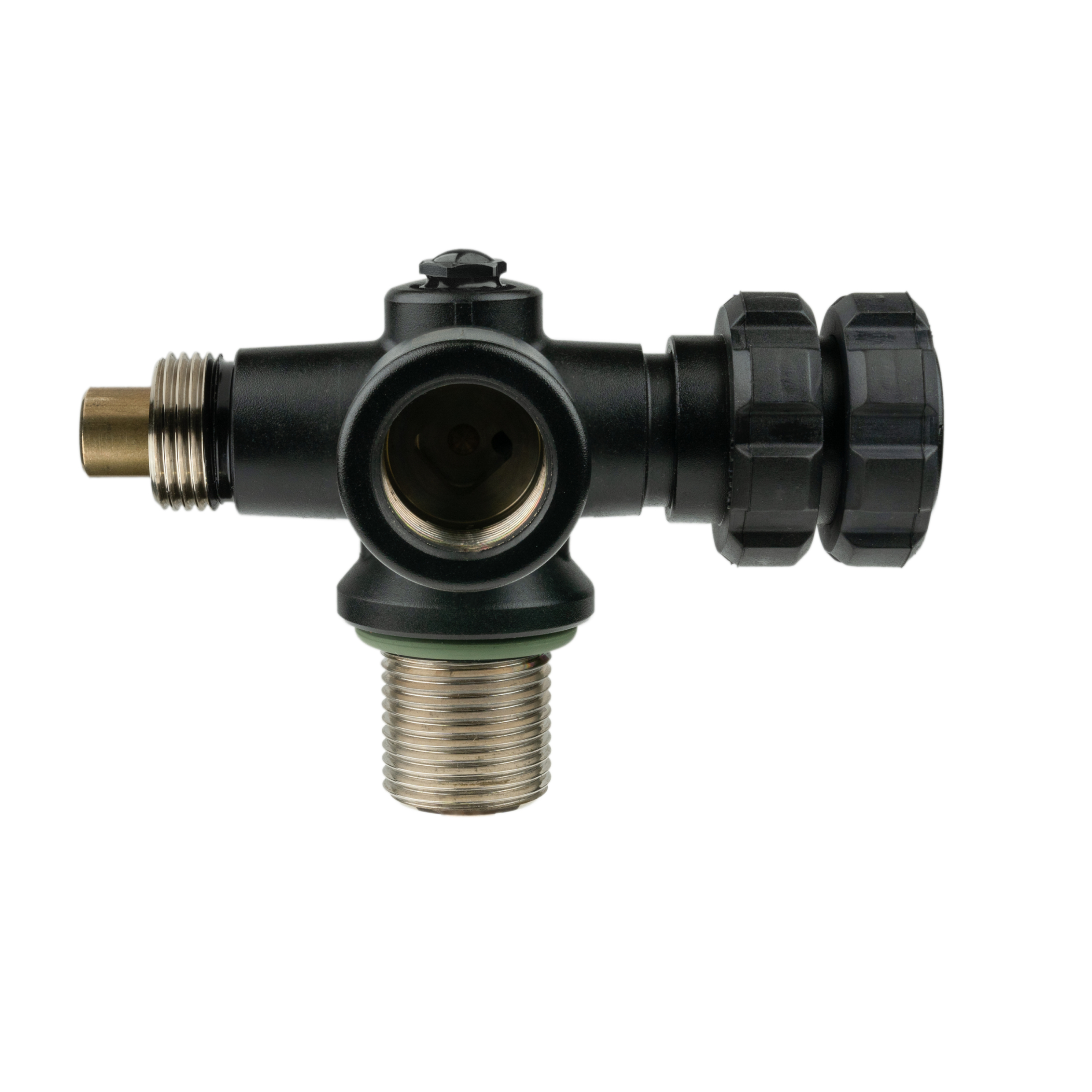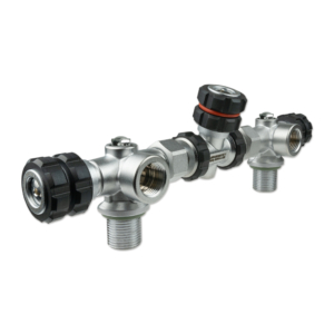For compressed air double cylinders with flange diameters of 140 or 171 mm, 232 bar. A pro valve trim consisting of 2 Nautec SL-90° Extendable Valves (left und right), radially sealing TEC manifold, “Full-Metal-Core-Rubber Knobs”, two Nautec micro filters and two blind stops for the G 5/8” regulator connections. All valve outlets can be shut off separately, the gas flow can be safely turned off using the Nautec TEC manifold between two flanges. Located opposite the hand wheel, is a connection port for a stub pressure gauge or a dive computer transmitter with 7/16″ connection thread.